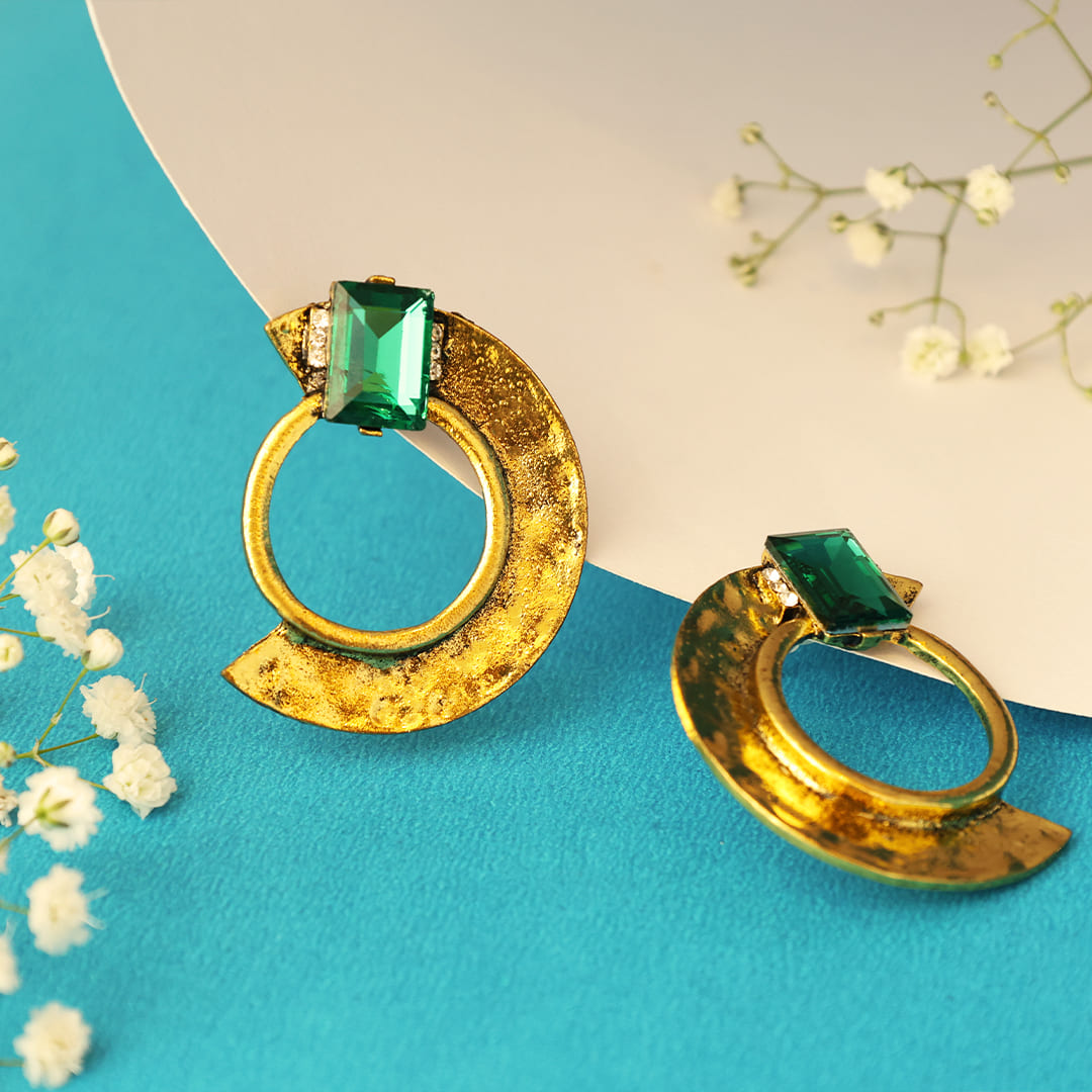 Make a bold statement with our Emerald Charm Crescent Earrings, designed for those who love a fusion of vintage charm and contemporary style. These earrings feature a striking gold crescent hoop with a rich green emerald-cut stone at the top, adding a pop of color and sophistication. Adorned with delicate embellishments, they offer a regal yet edgy appeal. The slightly distressed gold finish enhances their raw beauty, making them a must-have accessory for fashion-forward individuals. Perfect for both festive and evening wear, these earrings effortlessly elevate your style.