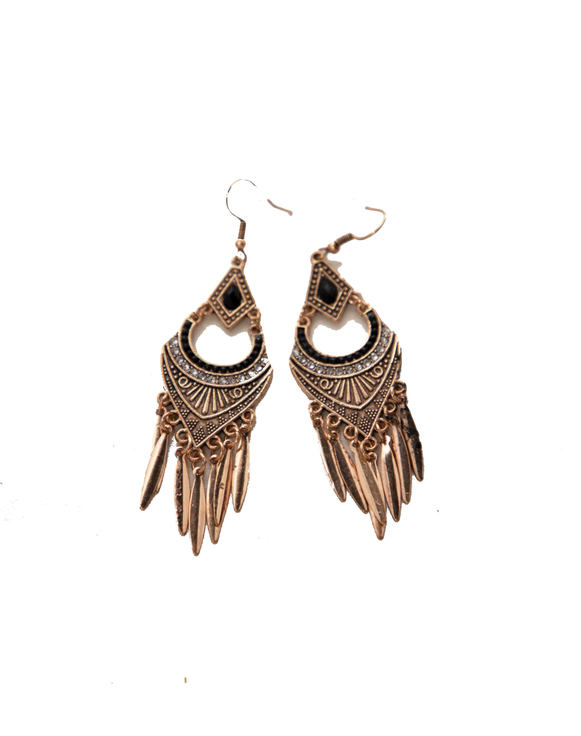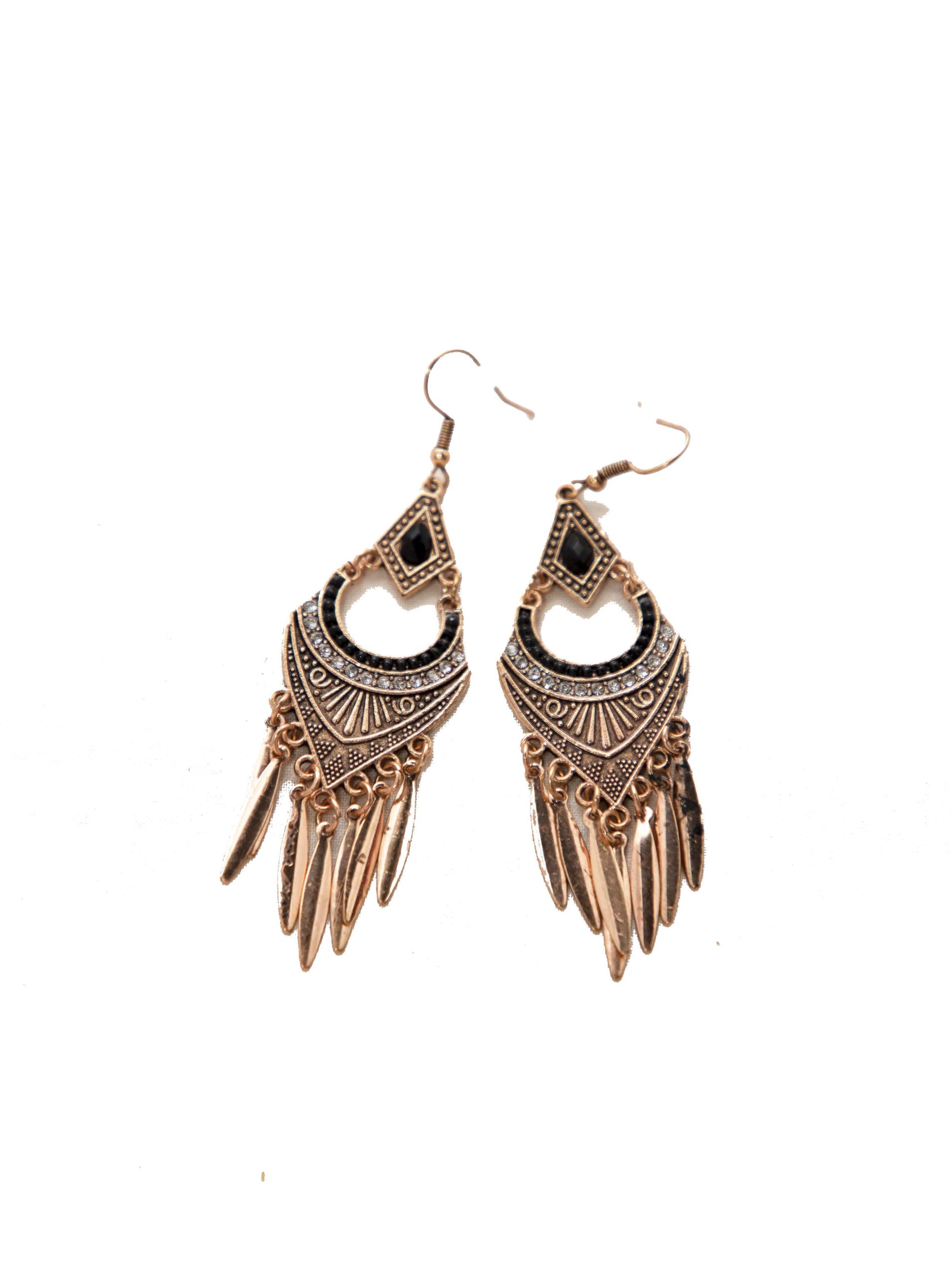 Make a bold style statement with these exquisite Bohemian Vintage Gold-Toned Dangle Earrings. Designed with intricate tribal patterns, sparkling white stones, and striking black gemstone accents, these earrings exude a timeless elegance. The crescent and diamond-shaped detailing add to their unique charm, while the hanging metallic spikes give them a dynamic and edgy look. Crafted with a lightweight alloy, they are comfortable to wear all day long. Perfect for casual, festive, or ethnic outfits, these earrings are a must-have for fashion lovers.