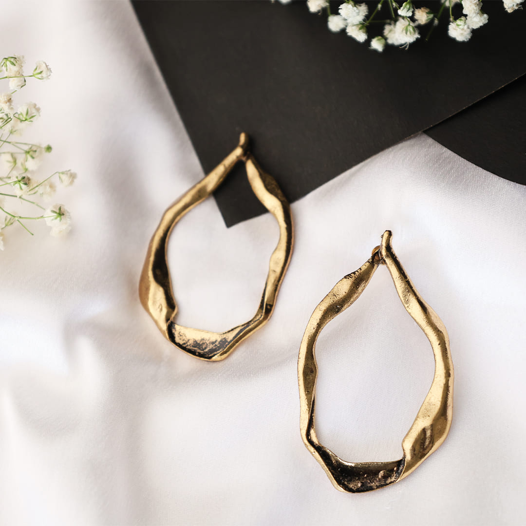 Inspired by the beauty of nature’s raw textures, these open-frame hoop earrings redefine elegance with an organic, freeform design. The fluid, irregular structure gives them a modern, artistic appeal, making them a bold statement piece. Crafted in a radiant gold-tone finish, these lightweight earrings add effortless charm to both casual and formal outfits. A must-have for those who love unique and unconventional jewelry!